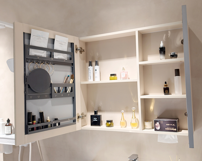 以半開放結(jié)構(gòu)與鏡面柜體,構(gòu)筑藏與露的收納哲學(xué)。紙巾等常用之物隨手可取,冗余雜物隱于光影。